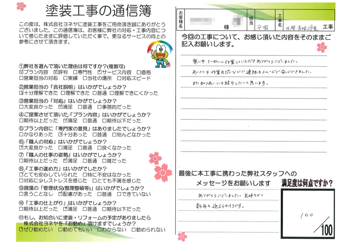 外壁・屋根塗装・防水工事に対するお声を頂戴いたしましたのでご紹介させていただきます!